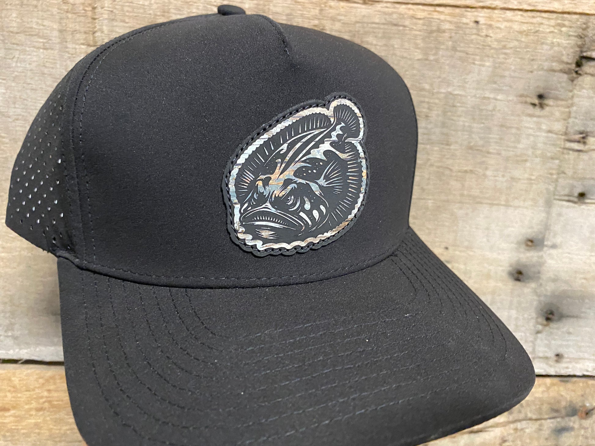 Angry Flounder design engraved on top quality materials. Stitched directly to hat.