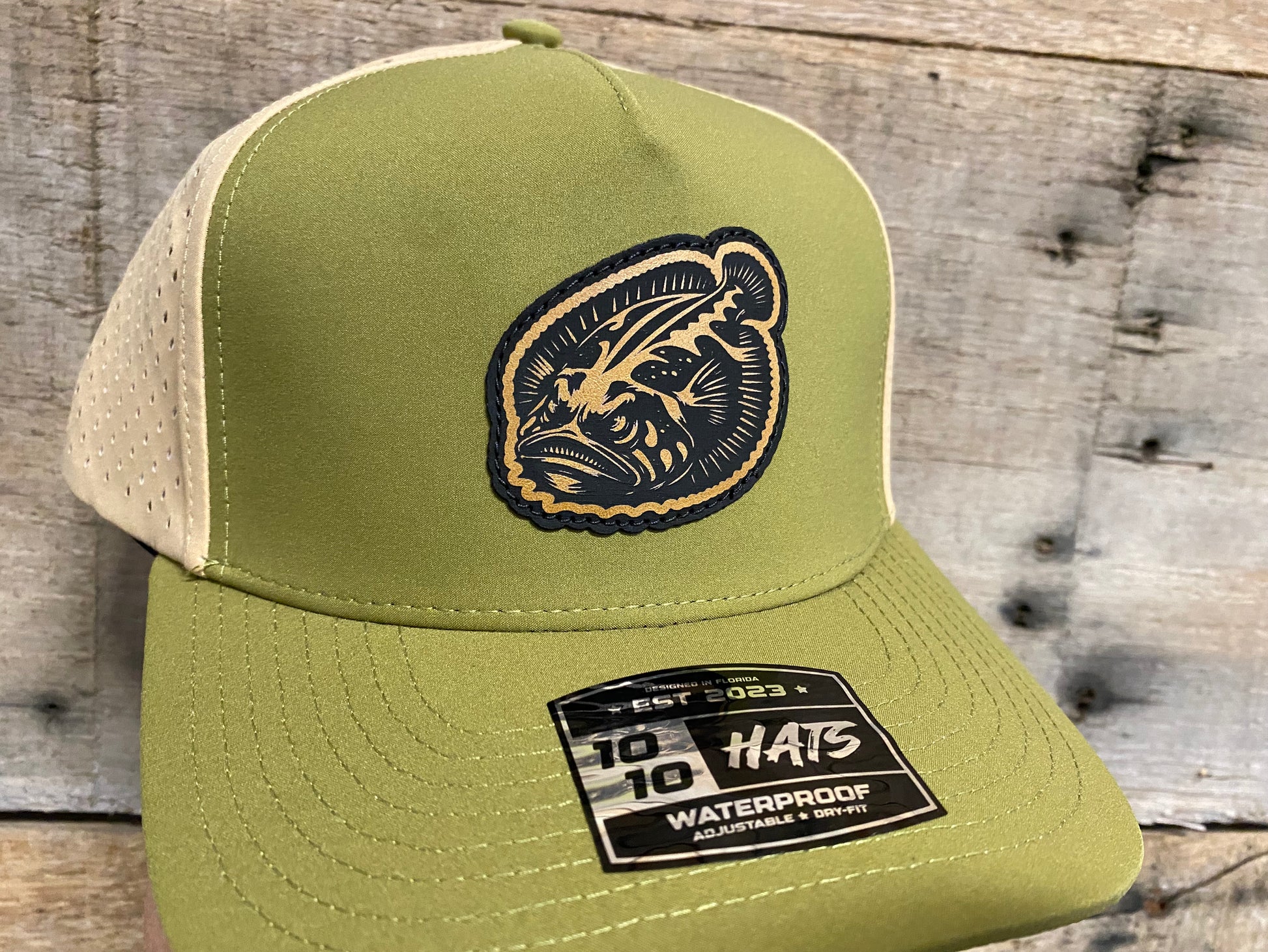 Angry Flounder design engraved on top quality materials. Stitched directly to hat.