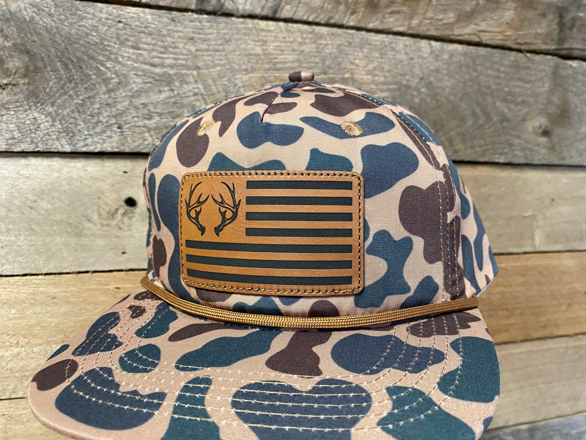 Laser engraved design of an antler US flag. Stitched directly to hat.