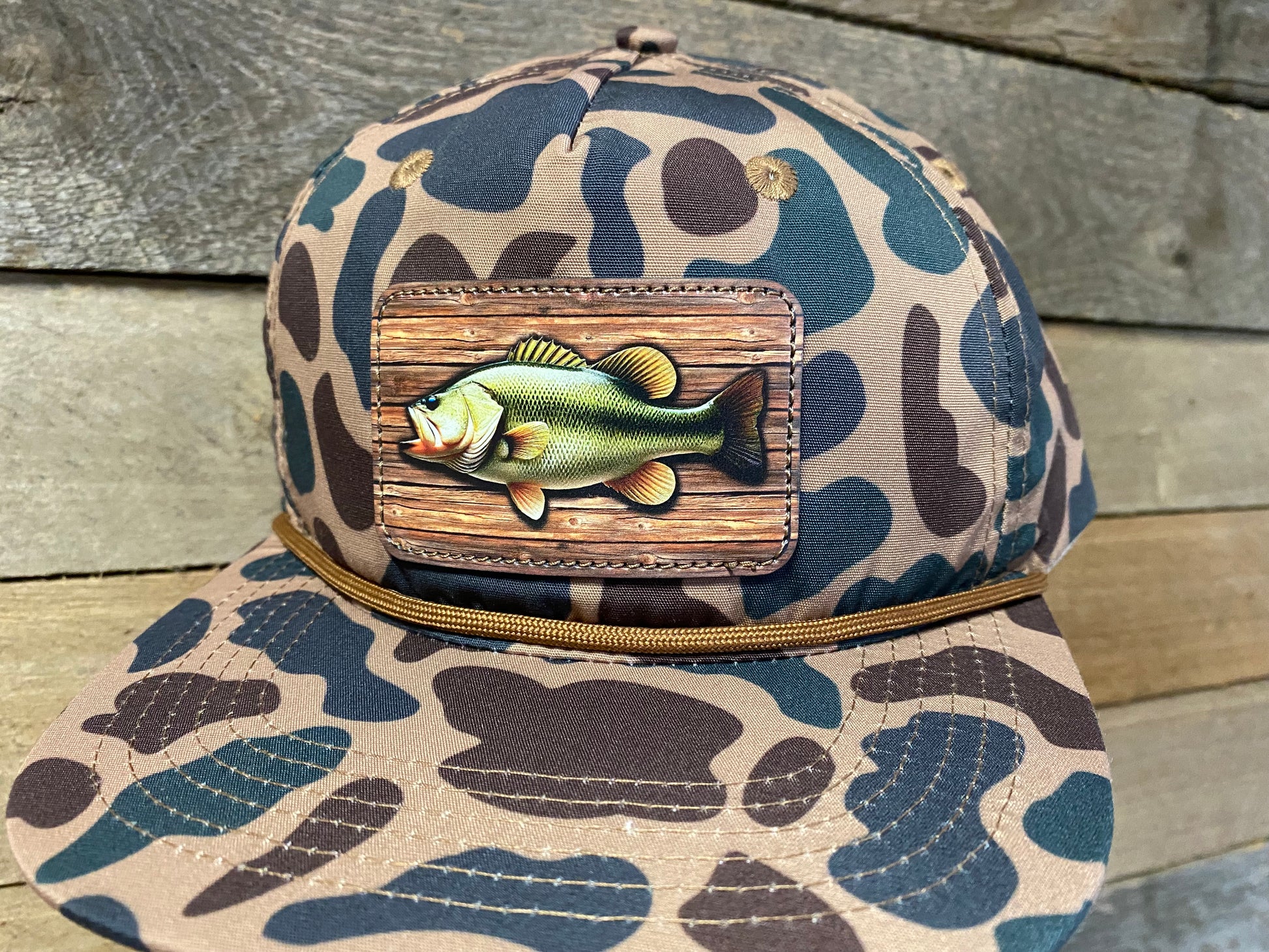 Full color print of a bass on wood planks. Stitched directly to hat.