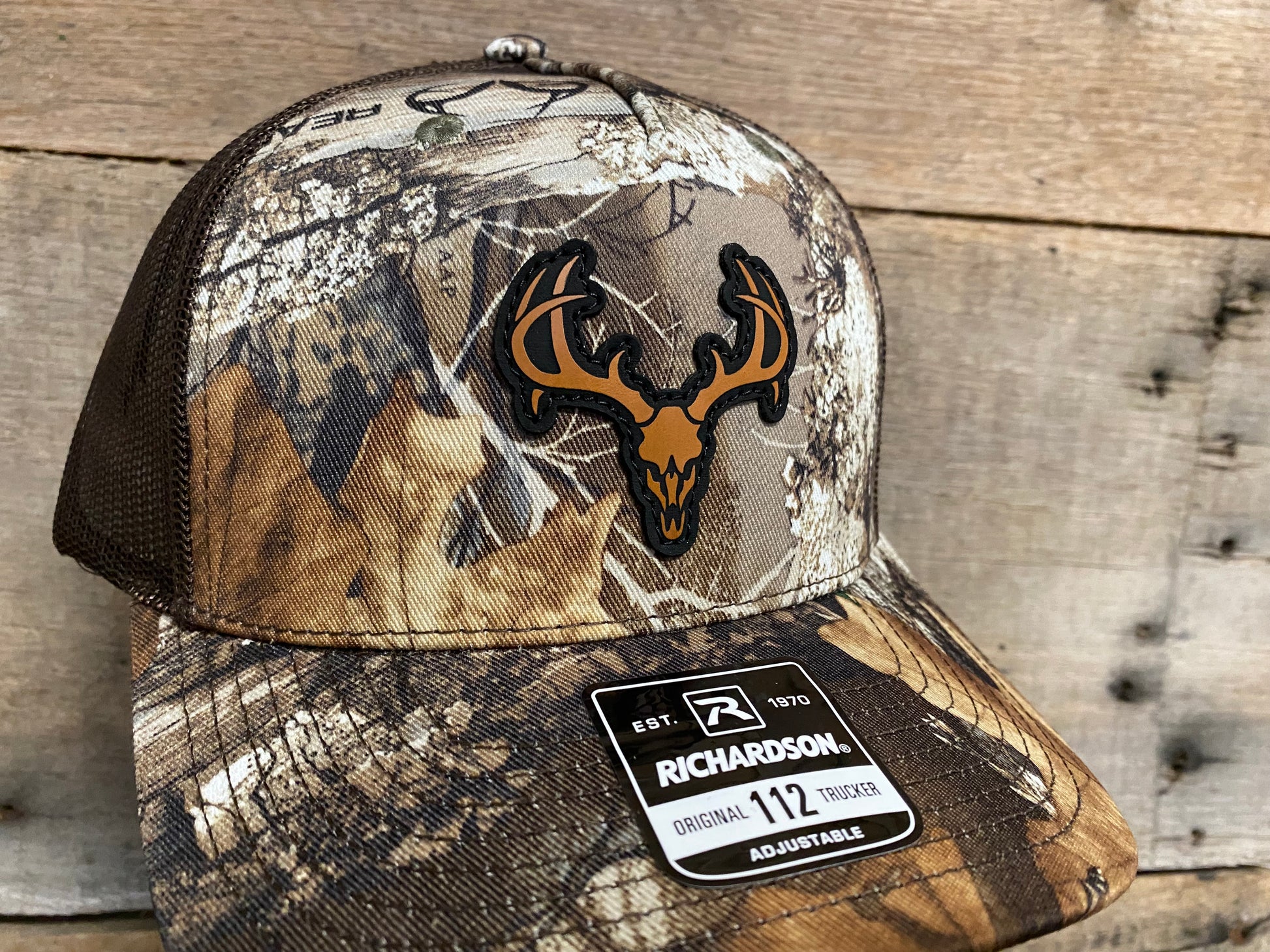 Deer skull engraved design stitched directly to a Richardson 112 trucker hat.