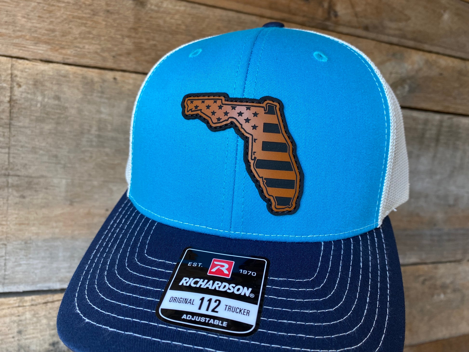 Florida state outline with US flag inlaid. Design engraved on top quality leatherette and stitched directly to hat.