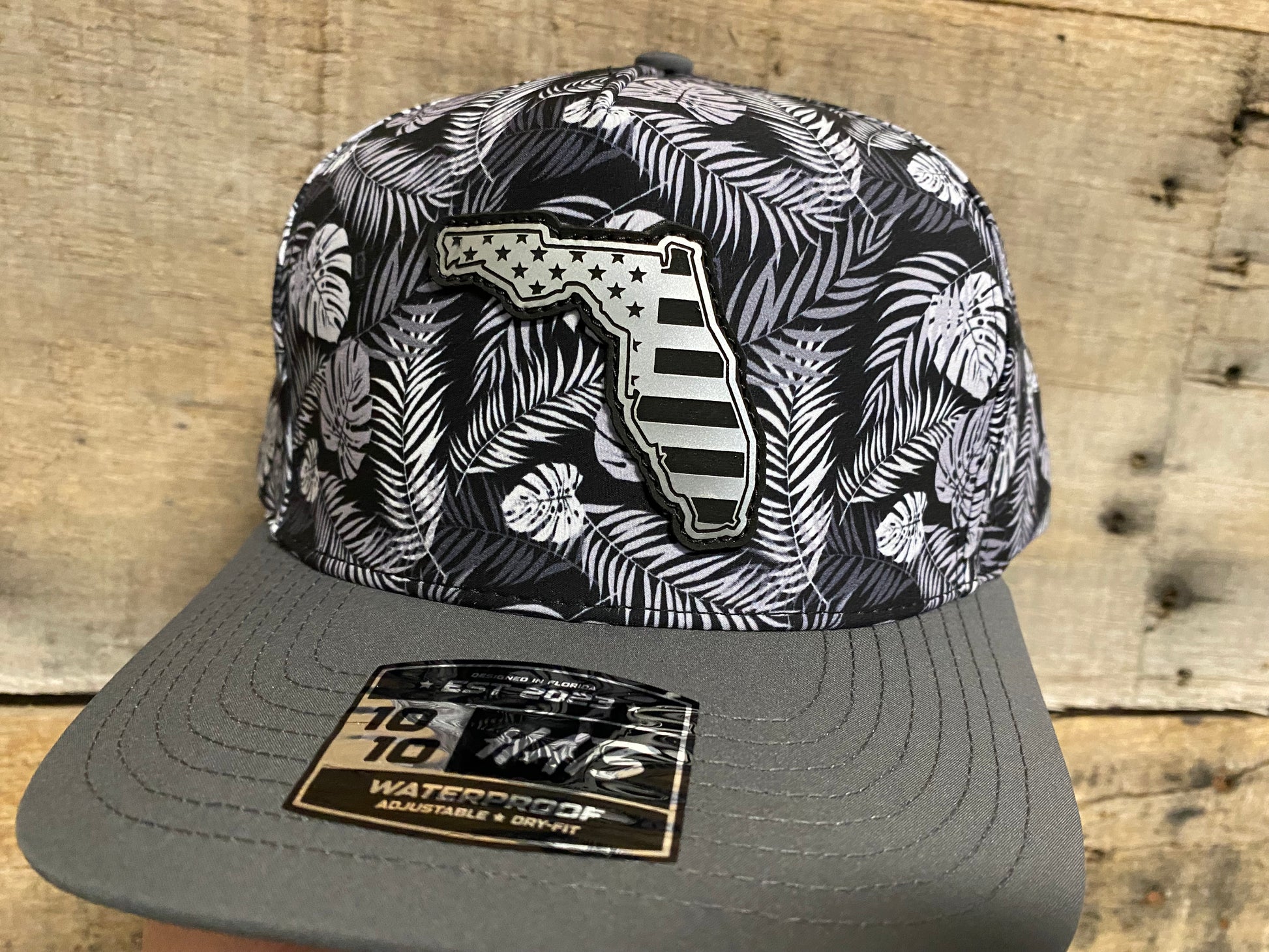 Florida state outline with US flag inlaid. Design engraved on top quality leatherette and stitched directly to hat.