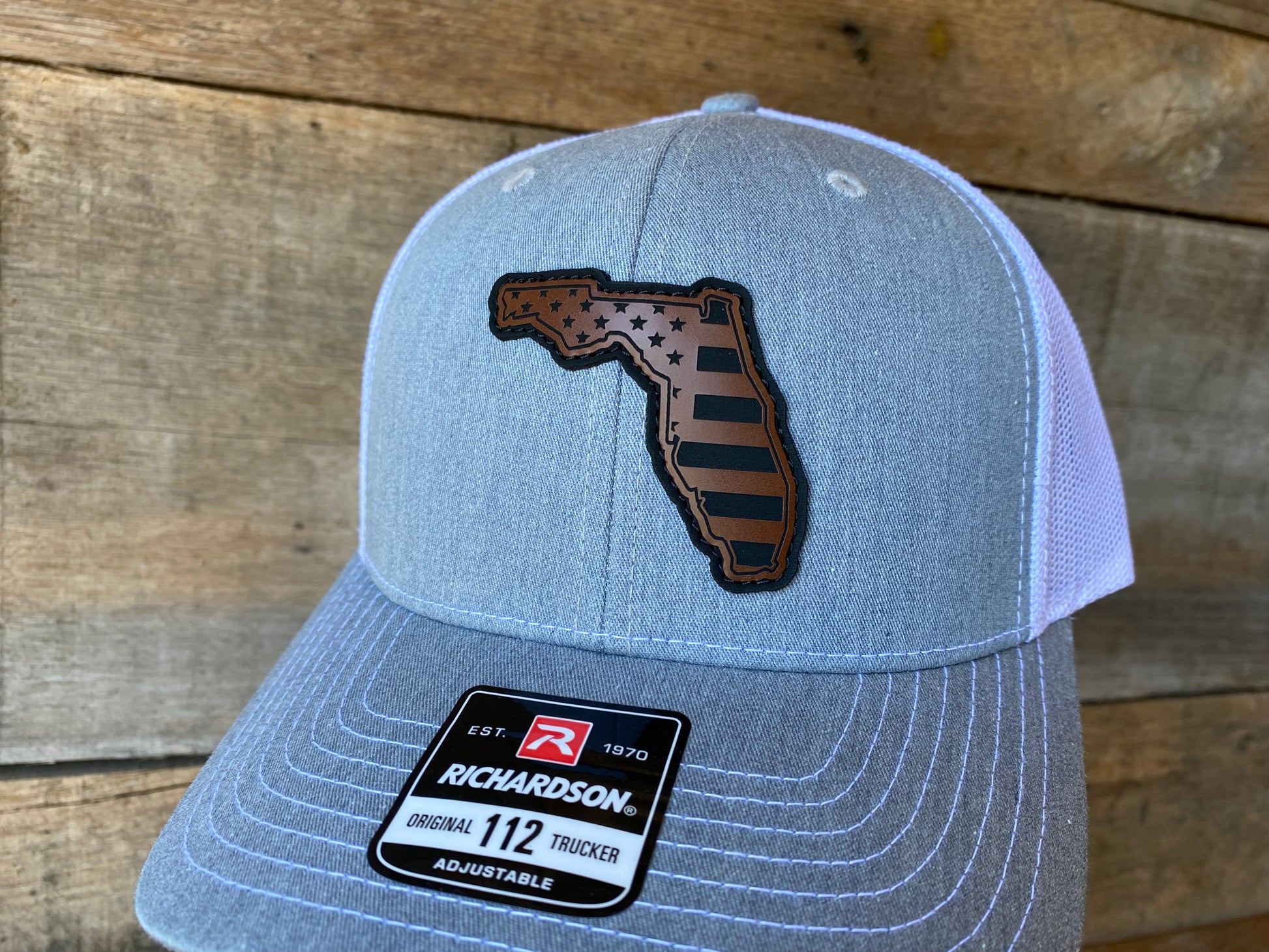 Florida state outline with US flag inlaid. Design engraved on top quality leatherette and stitched directly to hat.