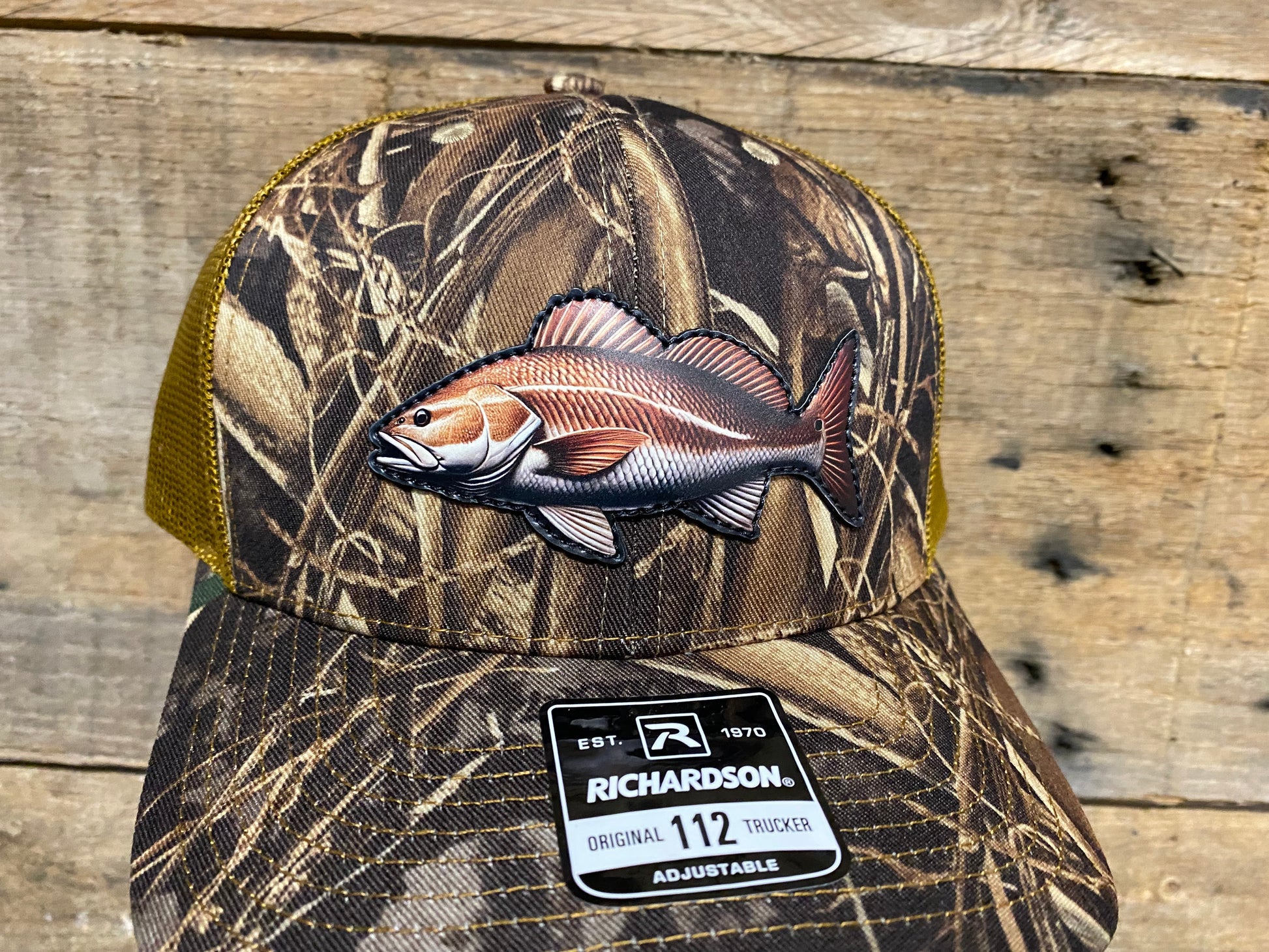 Full color printed redfish design stitched directly to a Richardson 112 trucker hat.